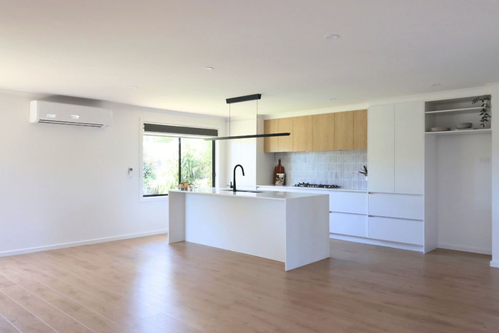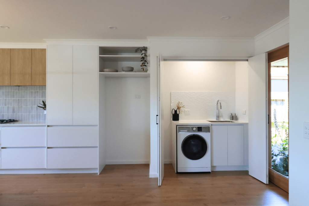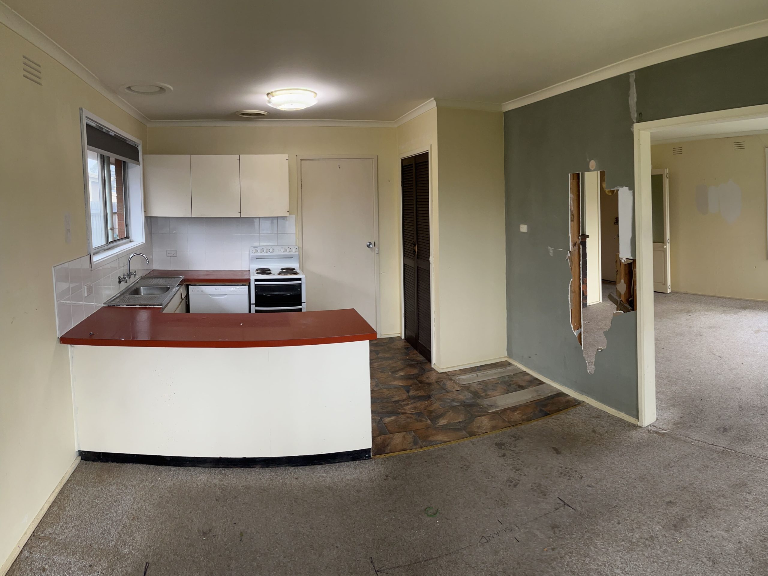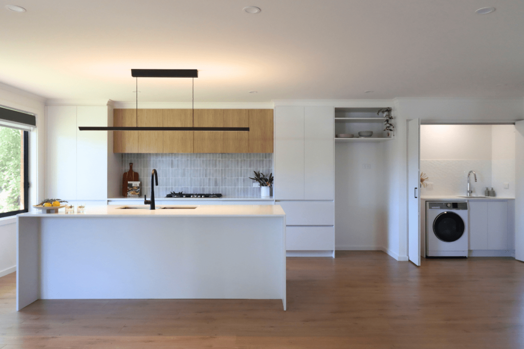 Our clients for this renovation purchased their first home as a fixer-upper. This renovation included opening up the previously separated spaces to create an open-plan kitchen, living and dining area. We also included a European laundry to allow for glass doors to be installed in the future outdoor entertaining space. The renovation also included new flooring throughout, a new feature front door and a solar tube skylight to the once-dark hallway plus many other updates. The transformation is quite spectacular and our clients are loving their new home. The project cost for this renovation was $80,000+.